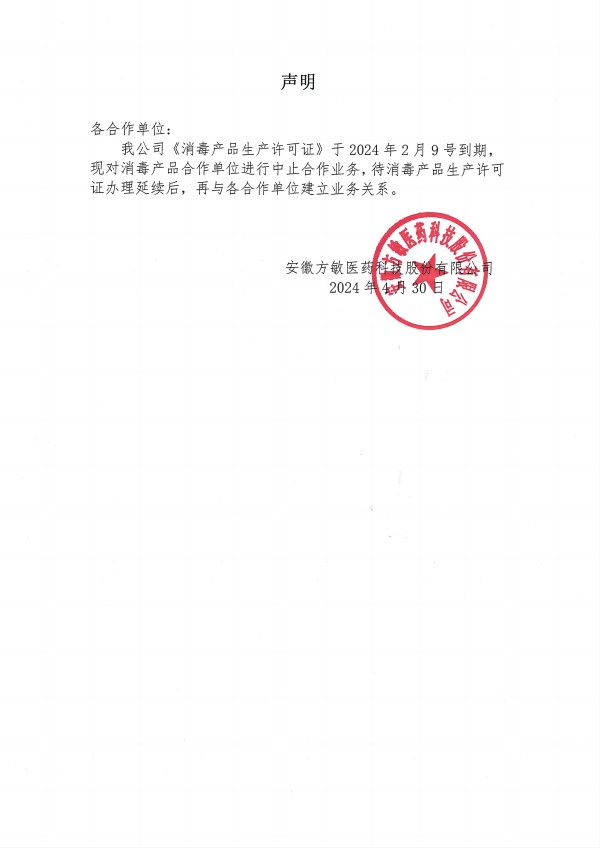 我公司《消毒產(chǎn)品生產(chǎn)許可證》于2024年2月9號到期,現(xiàn)對消毒產(chǎn)品合作單位進行中止合作業(yè)務,待消毒產(chǎn)品生產(chǎn)許可證辦理延續(xù)后,再與各合作單位建立業(yè)務關(guān)系。